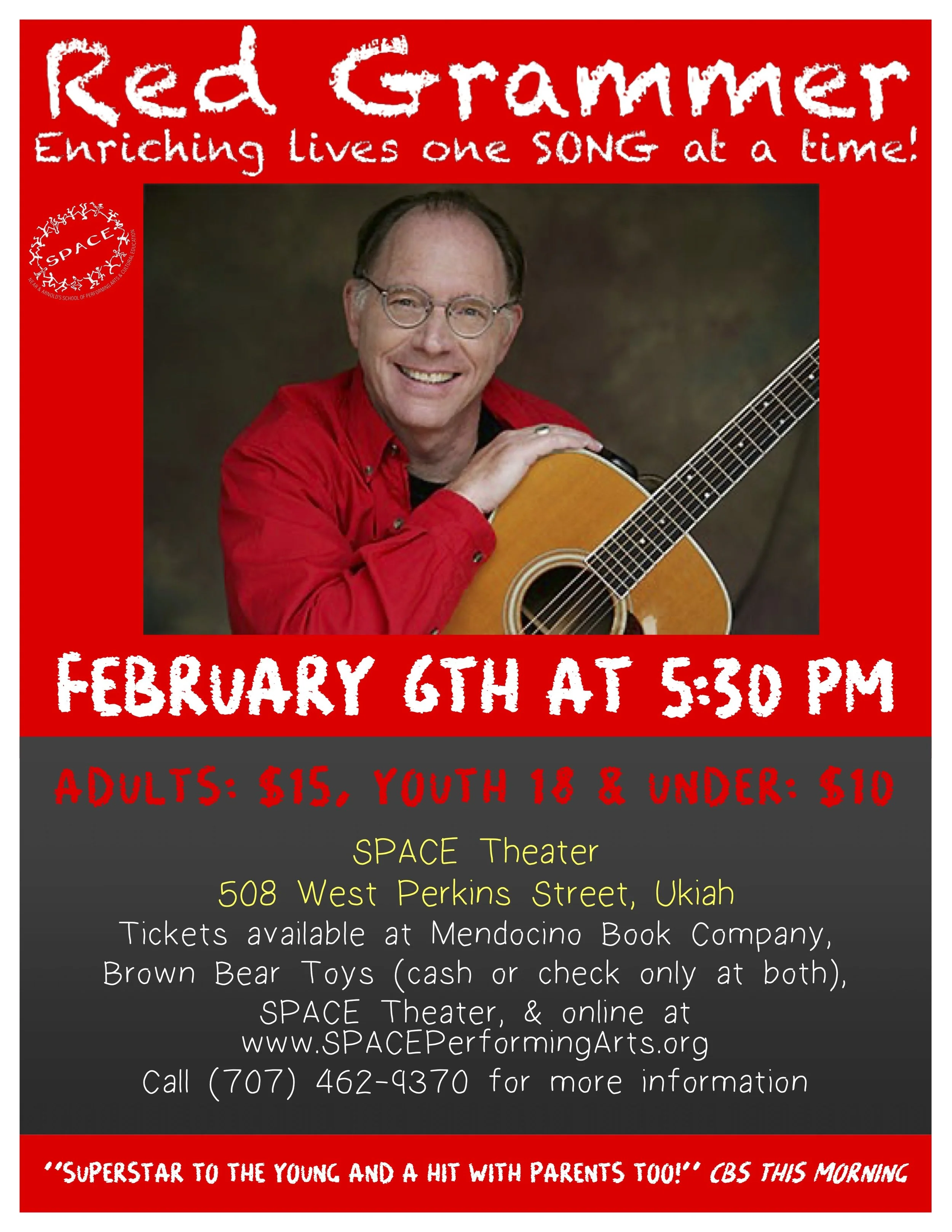 This performance will be fun for the entire family and is at SPACE Theater on Friday, February 6, at 5:30 pm. General admission tickets are $15 for adults and $10 for children under 18, and are available at The Mendocino Book Company (cash or check), Brown Bear Toys (cash or check), and the SPACE Box Office. The SPACE Theater is located at 508 W. Perkins St., Ukiah. For more information, call 462-9370 or visit www.spaceperformingarts.org.