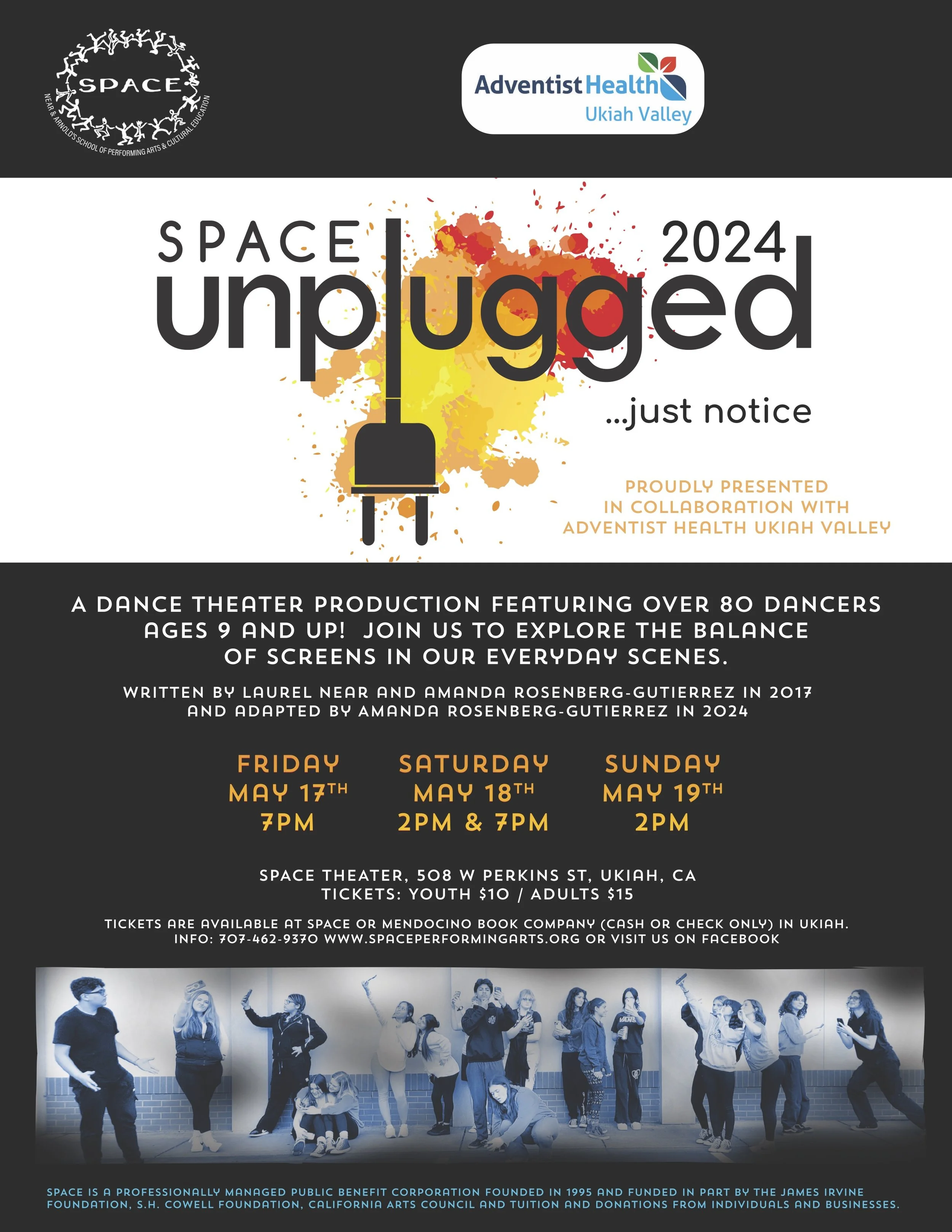SPACE (Near & Arnold’s School of Performing Arts & Cultural Education), in collaboration with our stellar partner Adventist Health, is thrilled to unveil a mesmerizing and heart-pounding extravaganza: "Unplugged…. just notice!" an original show focusing on the benefits and challenges of screens directed by Amanda Rosenberg-Gutierrez, featuring over 80 dancers ages 9-up.